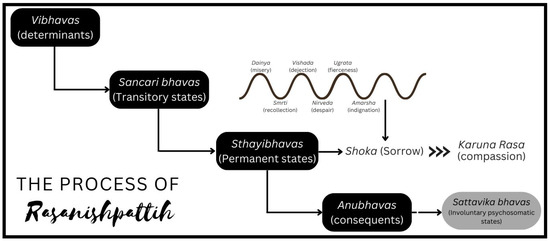 Bharata’s Natyasastra describes eight rasas in its sixth and seventh chapters, namely, “Erotic (sringara), Comic (hasya), Pathetic (karuna), Furious (raudra), Heroic (vira), Terrible (bhayanaka), Odius (bibhatsa), and Marvellous (adbhuta)” (Bharata 1951, p. 102). The ninth rasa, quietude or tranquillity (shanta rasa6), was introduced later by Udbhata in Udbhata Kavyaalankara Sara Sangraham. In the process of rasanishpattih (production of rasa), determinants (vibhavas) and consequents (anubhavas) represent the causes and the final effects in a kavya, respectively. Let us have an example; in one of the stories in the novel, the Dumb Madwoman of Dauli is lamenting over the dead body of her son in the middle of the Kalinga battlefield. Here, the dead body, the battlefield, and the blood are the ‘determinants’ (the main event, atmosphere, and context) that stimulate transitory states (sancari bhavas7), such as misery, recollection, dejection, despair, and anger, in the character (the Madwoman). While a text carries multiple transitory emotions, it always has a single dominant/permanent emotion (sthayibhava), which would be pervasive throughout a kavya (literary text); as Chari writes, “The transitory states can exist only as accessories to one of the prime emotions, serving the purpose of intensification or contrast” (Chari 1993, p. 61). The eight permanent states—love (rati), humor (hasya), sorrow (soka), anger (krodh), enthusiasm (utsaha), fear (bhaya), repulsion (jugupsa), and wonder (vismaya)—are stable emotional states “innate in every person” that correspond to and generate eight rasas in the reader/spectator (Maity 2019, p. 105). The transitory emotions surface to contextualize and maintain the permanent emotion and then disappear themselves in a kavya. Thus, the permanent emotion of ‘sorrow’ is permeated throughout The Dumb Madwoman’s story. These transitory and permanent emotions are reflected in a character’s8 behavior through his/her physical, verbal, and motor reactions, which are called consequents (anubhavas). Consequents further contain eight involuntary psychosomatic states (sattvika bhavas9), which are characters’ spontaneous bodily and psychic reactions, such as trembling, horripilation, and so on. The permanent state of sorrow and its allied transitory emotions can be observed in The Dumb Madwoman’s behavior (consequents)—crying, shouting, stroking the head of her son, and so on. The oft-quoted words of Bharata sum up this process in an aphoristic manner, “Vibhavanubhav-Vyabhichari-Samyogat-Rasanishpattih” (the accumulation [samyoga] of vibhava, anubhav, and vyabhicari bhava10 produces rasa) (Mathur 2023). Thus, the Dumb Madwoman’s story would ultimately stimulate karuna rasa (pathetic/compassion) in the psyche of the reader/spectator. Figure 1 explains the upper-discussed paraphernalia of rasanishpattih. However, as Chari suggested, this whole “layout of situation factors can be expected only in a long composition, for example, a drama, an epic, or a novel” (Chari 1993, p. 54). A short story or a lyric may incorporate one or two of the elements prominently and other elements may be briefly implied, which also should not hinder the manifestation of rasa.