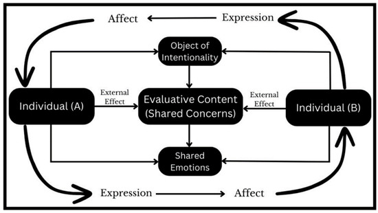 Evaluative content refers to the value Individuals A and B assigned to the object of intentionality, which then determines the degree of their shared concerns. ‘External effect’ refers to how ‘shared concerns’ are affected (adversely or favorably) by external circumstances, which then gives rise to corresponding emotions. (Figure created by the authors).