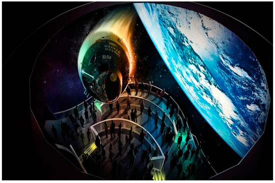 The immersive experience is created by AR holograms delivered through 3D glasses worn by visitors to the centre. Exhibition spaces are referred to as ‘theatres’ and include a media screen that wraps 220 degrees around the visitors. The 4D show places visitors on a floating platform, where they encounter holograms of ‘space-flown artifacts’ such as space capsules, iconic WW2 aeroplanes and contemporary fighter jets. The holograms are brought to life through sound, lighting, wind and smell effects. Interviews with astronaut heroes such as Buzz Aldren and Thomas Stafford provide first-hand accounts of their experiences (see