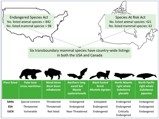 The number of animal and mammal species listed under the SARA (in Canada) and ESA (in the USA) are outlined, as well as the number of mammal species with both transboundary distributions and country-wide listings in Canada and the USA. Only six mammal species meet these criteria i.e., the whole species is listed across the entirety of the country, not just a specific population. Specific listings for each of these six species under the SARA and ESA are indicated, as well as their corresponding IUCN classification (if applicable).