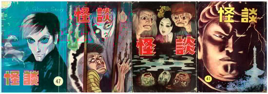 As Yonezawa suggests, the stories presented in these journals can be roughly divided into two macro-groups: on the one hand, stories set in Japan’s past (the so-called jidaimono, 時代物); on the other hand, those set in the present (the gendaimono, 現代物) (Yonezawa 1996, p. 55). In both cases, however, what emerges and seems to unite them is the presence, even in the titles of the stories, of certain kanji/synographs that are endlessly repeated: mystery/enigma (kai, 怪), strangeness/ordinary (ki, 奇) and fear/terror (kyōfu, 恐怖). In both the stories set in the Tokugawa era (1603–1868) and those set in the Tokyo of skyscrapers, amidst murders and eerie demonic presences, a deliberate perturbing effect, linked to a sense of anguish mixed with fear, is clearly evident: severed heads, treacherous cats, ignis fatuus accompanying the entry on the scene of spirits thirsting for revenge, evil little girls, ruthless murderers, etc.