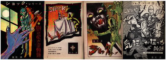 In analyzing the works published in these comic magazines, a summary classification could be attempted, taking into account the main narrative strands: (1) kaidanmono (怪談物), stories set in Japan’s past, with original tales or simple retellings of ancient ghost legends; (2) ingamono (因果物), unfortunate stories linked to a tragic karmic fate; (3) onryōtan (怨霊譚), stories of revenge and resentment within which a spirit or ghost returns among the living to avenge a wrong suffered (Yonezawa 1996, p. 55). Over the years, the themes of these comics began to diversify more and incorporate new suggestions from foreign fiction as well. Classic themes of revenge were joined by stories based on irrational or psychological fears, supernatural phenomena, voodoo rituals, magic and witchcraft. Also, since 1960, new publications with “horrific” themes, such as Kaidan book (怪談ブック), continued to appear, aiming to build reader loyalty with serialized works rich in pathos and unusual narrative contexts. Emblematic in this regard is the Shokku shirīzu (ショックシリーズ, Shock Series) by Baron Yoshimoto (バロン吉元, b.1940), a celebrated manga author who, in those years, still did not sign his nom de plume, but with his proper name, Yoshimoto Tadashi (吉元正) (Figure 3).