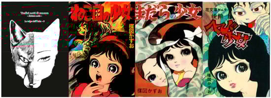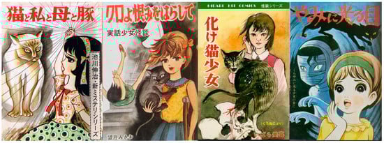 A good number of stories revolve around the vicissitudes of cats endowed with supernatural powers who, through vicissitudes of various kinds, turn into human beings to avenge a wrong suffered (Davisson 2022). Here, too, references to the rich heritage of Japanese folklore, the figures of the yōkai (妖怪) and the legends of the past often paid homage to in literature and art as well, are clearly visible. One need only think, for example, of the terrifying cat of the Saga fiefdom (佐賀の怪猫, Saga no kaibyō), “the protagonist of an almost inexhaustible epic of felines with supernatural powers” (Orsi 2021, p. V) and the model for an endless series of stories of cats animated by deep resentment and endowed with metamorphic abilities, the so-called bakeneko (化け猫). The figure of the cat, understood as a supernatural, vengeful and evil entity, has remained a topos of horror comics, crystallizing one of its most recurring narrative motifs. The cat, often black in color because it is associated, ça va sans dire, with night, mystery and all that lurks in the shadows, is an inescapable constant in this genre of stories, declined then in countless variations. One need only think of titles, especially aimed at an audience of young female readers, such as Kin’iro hitomi (金色のひとみ, Golden Eyes, 1960) by Kuroda Minoru (黒田みのる, b. 1928), Koga Shin’ichi’s Yami ni hikaru me (やみに光る目, Eyes Shining in Darkness, 1966), Neko to watashi to haha to buta (猫と私と母と豚, The Cat, Me, Mom and the Pig, 1968) by Ikegawa Shinji (池川伸治, 1938–2011) or to Bakeneko shōjo (化け猫少女, The Cat Girl, 1982) by Ibara Miki (Figure 4).