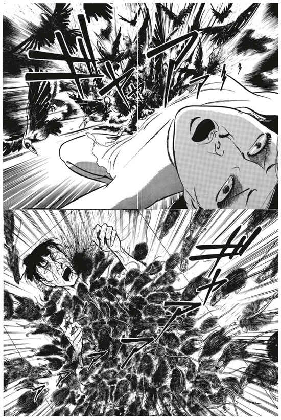 Among the various “subgenres” of horror comics, the guro—from the term gurotesuku (グロテスク, grotesque, bizarre, horrific)—still enjoys a certain popularity today. Harkening back to the artistic tradition of muzan-e (無残絵), the atrocity prints typical of the Tokugawa era, many authors structured their stories by resorting to crude and gruesome images to shock and frighten the reader: severed heads, blood, disfigured faces, eyes out of their sockets, entrails leaking from the body, torture. Some manga covers replay the top moments of the story, thus introducing the reader to the unreassuring atmosphere of the comic book and announcing to them a good dose of fear. Unlike a movie, however, a manga cannot rely on a soundtrack to punctuate its narrative timing or highlight its moments of greatest emotional intensity. Consider, for example, the shower scene in Alfred Hitchcock’s (1899–1980) film Psycho (1960) and the role that music plays at that precise moment: without the music and without that emotional crescendo, the scene would certainly have had less emotional impact on the audience. That is why full-page or double-page scenes (so-called splash pages) with gruesome images abound in horror manga. These splash pages have the specific task of shocking the reader at the exact moment when he or she turns the page and is suddenly confronted with a terrifying and visually striking scene. Take, as an example, two of the double splash pages from Kamimura’s Onryō jūsan’ya (Figure 6). These splash pages unexpectedly strike the reader, unsettling and destabilizing the reading experience.