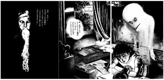 Tsunoda, unlike other cartoonists, does not resort too often to disturbing and gruesome images to shock the reader, but prefers to rely on a simple narrative that can allow for identification between the protagonist and the reader. According to much of the criticism, the absolute verisimilitude of the events narrated in his manga could instill fear in his readers, even by performing trivial everyday actions (waking up in the middle of the night to go to the bathroom; not wanting to open a wall closet with the fear that a ghost might pop out, etc.; Tsuruta 2002, p. 365). For Tsuruta Norio (鶴田法男, n. 1960), the director of the film version of this manga, the “fear” that grips the readers of Bōrei gakkyū is of two kinds: “a fear that breaks down the boundary between fiction and reality” and that stages a real feasibility through a fictional story, and “an irrational fear” triggered by an unexpected incident that disrupts the life of a quiet student like so many others (Tsuruta 2002, p. 366). A fear that lurks within us is ready to explode at any moment (Figure 8).