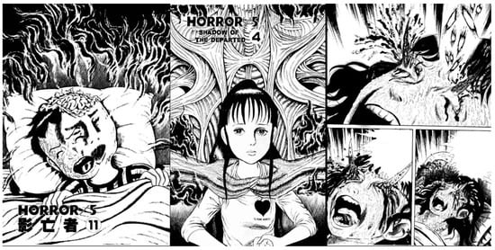 Transformation becomes the viaticum for a series of irrational fears that disrupt the life of the main character and are masterfully portrayed in the manga of Umezu Kazuo, the undisputed father of horror manga. For Umezu, in fact, one of man’s greatest fears consists of not being able to understand himself: not having, therefore, awareness of his own self, the human being perceives himself as another separate entity, a double (Umezu 1996, p. 10). One of the main leitmotifs of Umezu’s horror manga rests on a simple fear, namely that one day, suddenly, any human being will stop being himself (or what he mistakenly believed himself to be) and turn into something else. In some of his most famous works, such as Nekome no shōjo (ねこ目の少女, The Little Girl with Cat’s Eyes, 1965), Madara no shōjo (まだらの少女, The spotted girl, 1965) and Hebi shōjo (へび少女, The Little Snake Girl, 1966), the protagonists or their antagonists transform into animals or insects, arousing compassion and at the same time revulsion in the eyes of readers (Figure 5). Again, in other Umezu manga, the metamorphosis is intimately connected with the characters’ stage of growth and their transition from childhood to adulthood: little girls or boys who suddenly find themselves in an adult body, ill, lacking freedom and autonomy. In this case, horror tries to appeal to the psychological side, feeding unconscious fears related to the body’s growth and development.