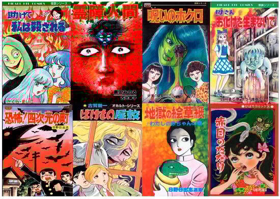 As magazines boomed in the 1960s, there was also an interest in this genre of stories from a younger audience. Although adult magazines continued to feature horror stories, the most notable change related to the emergence of a new readership, namely children and adolescents. These are years in which “terror” seems to have found fertile ground especially among female audiences, to the point of leading to the birth of a veritable publishing strand renamed shōjo horā manga. Watanabe Masako, for example, was among the first authors to sense the potential of these stories, scattering references to classic American horror films in her works (above all, What Happened to Baby Jane? in Garasu no shiro, 1969) (La Marca 2014, pp. 59–62) or telling stories of little girls with angelic beauty who hide, however, a wicked and bloody nature (Saint Rosalind, 1973). The general trend of those years is, therefore, to abandon the kaidan repertoire in favor of more contemporary and realistic narratives (Japanese schools, mountain villages, city neighborhoods, etc.), so as to facilitate the identification between the reader and the manga protagonist. Only through the plausibility/truthfulness of the narrated events will the reader be able to experience feelings such as anxiety, fear, and terror.