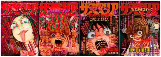 The baton of Hibari Comics would later be picked up in the late 1980s by other publishing entities, such as the magazines Harouin (ハロウィン, Halloween, 1986–1995) and Sasuperia (サスペリア, 1987–2012) and finally, in the 1990s, by Horā M (ホラーM, 1993–2010). It is worth noting that what revived the horror genre and gave it popularity once again was the female audience (VV.AA. 2016): after the first big boom of horror shōjo manga at the turn of the 1960s and 1970s, the 1980s brought this narrative genre back into vogue thanks to women’s magazines such as the aforementioned Halloween and, above all, Suspiria, whose title is an obvious reference/homage to the film Suspiria (1977) by Dario Argento (b. 1940). Amid stories of vampires, killer clowns, eerie demonic presences and urban legends, the manga published in Sasuperia boast the signatures of illustrious authors of the past (Hino Hideshi, Koga Shin’ichi and Tsunoda Jirō), combined with newcomers such as Kakinouchi Narumi (垣野内成美, b. 1962) and Inuki Kanako (犬木加奈子, b. 1958), a histrionic, irreverent and perturbing artist who has linked her name to the illustrations of this magazine’s most iconic covers (Figure 11) and who, not surprisingly, has been called the queen of horror manga (Midori no Gosunkugi 2021, p. 238).