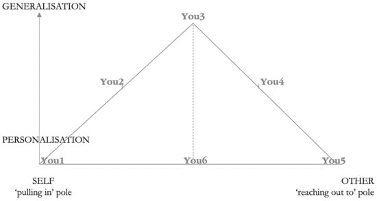 The frequent use of “you” in Ford’s war texts thus opens up the experiential frame to the reader, introducing an implicit dialogic structure. Yet, Sorlin demonstrates that the use and subsequent pragmatic effect of the second-person pronoun in narratives operates along a gradient on which “you” sits at varying degrees of distance between the poles of self and other on the one hand, and between the poles of personal and generic address on the other. Building from and updating Bettina Kluge’s “continuum of reference” (), Sorlin delineates six main types of “you” in second-person narratives. These types are thus organised on a gradient of distantiation from the self to the other in the wake of the continuum defined by Kluge, and Sorlin doubles this continuum with a vertical axis from personalisation to generalisation that will prove essential to elucidate the significance of pronoun shifts in Ford’s war essays (See Sorlin, Figure 1, “The six points of reference in ‘you narratives’”).
