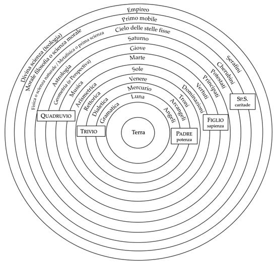 Despite a long and at times intricate explanation, the system that emerges from Book II is quite elegant and effective. Knowledge is framed within a cosmological system presided over by angelic hierarchies that contemplate the Trinity. Following the ascending architecture of the heavens, the series of sciences lays an ideal path leading to the highest form of knowledge, the ‘divine science’ corresponding to the empyrean. A visual schematic rendition of it could possibly look like this (Figure 1):