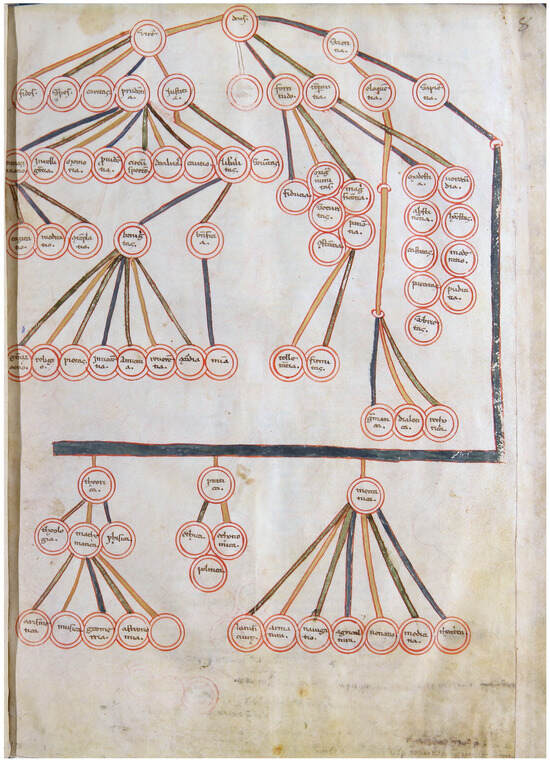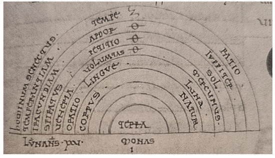 In some cases, the two traditions could overlap to create a composite diagram, wherein the structure of the cosmos serves as a scaffolding for other concepts, as exemplified in certain copies of Isidore’s Etymologie, where some planetary skies (with the earth at the center) are associated with moral features: the moon is coupled with oratio lingue, Jupiter with iracundia and ardor, and so on, whilst the heavens are framed between natura and ratio (Figure 3).