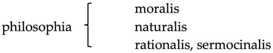 The basic models of medieval divisiones scientiae, variously modified and integrated with each other, are essentially two. The first one (Figure 4), deriving from the Stoics and attributed by Augustine to Plato (De civ. Dei VIII, 4; P. ()), divides philosophy into moral, natural, and rational (or sermocinalis) ().8