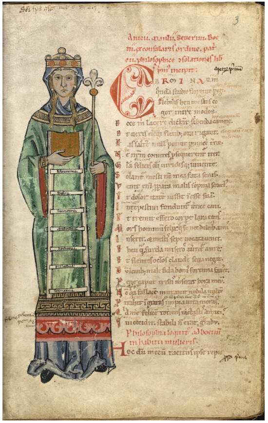 This second model has been embraced and transmitted by many authors, including the commentary to the Aeneid by Bernardus Silvestris.12 Boethius and the tradition that stems from his oeuvre stand out for their importance and influence. In the Consolation of Philosophy, the Π and Θ letters on the lower and upper hem of the robe, which Lady Philosophy herself wove (‘suis manibus ipsa texuerat’, Cons. Ph. I, pr. 1, in ()), refer to practical and theoretical philosophy and are connected by a ladder with an unspecified number of steps. According to the commentary by William of Conches, these steps symbolize the individual sciences in the order in which they should be studied: ethics, economy, and politics within the realm of practical philosophy; mathematics, physics, and theology in the domain of theoretical philosophy (it is worth noting that William’s commentary was the most widely circulated until the early fourteenth century and was probably read by Dante).13 Yet, throughout the Middle Ages, the steps of the ladder were also interpreted as the seven liberal arts, as seen in an illustration of a French manuscript of the Consolatio dating back to the second half of the twelfth century (Figure 6).