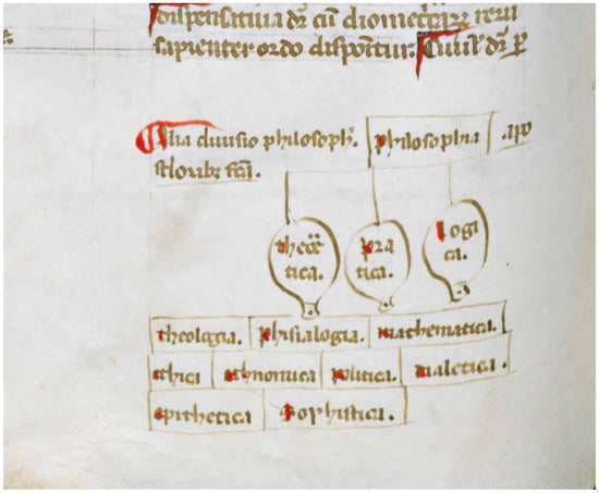 The description of disciplines that Dante provides aligns with the long-standing tradition of the so-called divisio scientiae (or divisio philosophiae), which has its roots in late Antiquity and persists throughout the Middle Ages (; , ; ). Besides texts entirely devoted to this aim, it is possible to find divisiones scientiae almost everywhere in medieval doctrinal texts; not by chance, in his own divisio, the Florentine Dominican friar Remigio de’ Girolami labels this scholastic practice as ‘frequenter recitanda’ (Div. sc. 1, in ()). Topical loci for the divisio scientiae are: commentaries to the Isagoge and to the second book of Boethius’ De Trinitate (; ); commentaries and quaestiones on the Metaphysics, as well as on other Aristotelian works; biblical exegesis and the commentary tradition on Virgil’s works. Of course, further topical places were the entries devoted to philosophy in lexicons and encyclopedias, whose indexes also reflect a general structuring of knowledge (). Finally, we can typically find divisiones scientiae in the introductions to philosophy and in the student guides developed in the Faculties of Arts (; ).