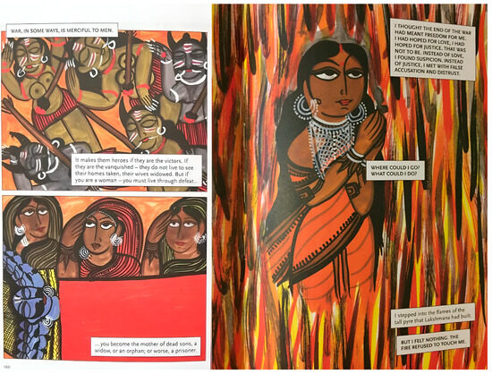 In scholarly discourse, Sita’s portrayal as a symbol of self-sacrifice, willingly giving up her own comforts and unwaveringly supporting her husband during his exile, has frequently been examined from a feminist perspective. There is a debate about whether Sita had full control over her decisions or if she felt pressured to conform to societal expectations of being a submissive wife (Albrecht 2023). In the novel under examination, Sita’s narrative takes a different approach compared to the traditional narrative. Notably, events such as the war are recounted to Sita indirectly through Trijata’s dreams, rather than being depicted as central heroic episodes. Sita notes the destruction of Lanka, “their people had met death on the battlefield—for what? For one man’s [Ravana’s] unlawful desire… It was such a high price to pay” (Arni and Chitrakar 2011, p. 118). This scene is accompanied by men on either side of the boxes, laid dead on the ground, with the women still and wide-eyed in horror. The narrative attention shifts to the suffering and experiences of other female characters, such as Trijata. After the war, “Lanka was destroyed, Ravan was dead. Kumbhakarna, Indrajit and thousands of other Rakhshasas had perished on the battlefield. But I could see their women crying… Trijata lamenting” (Arni and Chitrakar 2011, p. 119). This episode serves as a poignant reminder of the collateral damage experienced by women in the wake of men’s warfare.