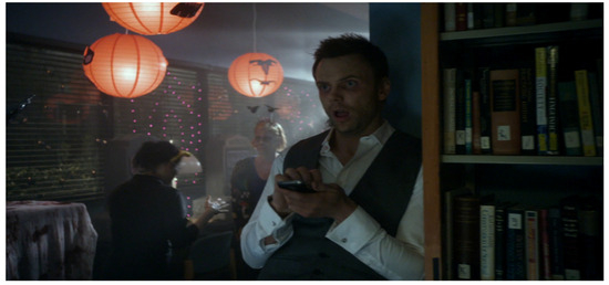 Yet fantasy serves an important purpose if the subject orients themselves to it correctly. Todd McGowan closes his book-length study of David Lynch films by suggesting “Fantasy allows us to discover our freedom only when we cease regarding it as an escape from our reality and begin to see it as more real than our reality. The real becomes visible in the obvious fakery of the fantasy” (McGowan 2007, p. 223). For McGowan, fantasy must cease operating as a private, privileged psychic space. By acknowledging the power of one’s fantasy, one “privileges the gap in the structure of ideology” (McGowan 2007, p. 223). Near the end of the episode, Troy survives, at least momentarily, by escaping the zombie-infested library. However, he decides to return to save his friends and everyone in attendance from “[getting] brain damage” (Dornetto and Hemmingway 2010, 00:16:11–00:16:12). Troy returns adorned in the Aliens (1986) costume from the beginning of the episode, a gesture he characterizes as “being a nerd” (Dornetto and Hemmingway 2010, 00:16:24–00:16:26). This is not, however, the fantasmatic moment of acknowledgment in this scene. Troy’s attempt to save everyone by cloaking himself in Ripley’s yellow power loader suit fails spectacularly (Figure 3). The zombie horde immediately overwhelms him and to his surprise, a zombified Abed bites him. Troy immediately feels the effects of the virus and falls to the ground. As he crawls to the thermostat,12 he sees a zombified Jeff, aloof and texting on his phone. As he claws helplessly on the ground, he says, “Jeff, still cool as a zombie” (Dornetto and Hemmingway 2010, 00:17:40–00:17:54). Troy inflects his reading of this line with sincerity. Unlike Jeff, Troy refuses to use this moment to offer a detached, ironic quip. However, the framing of both characters offers a thought-provoking juxtaposition. Troy crawls and fights to save his friends while Jeff remains stationary. The episode punctuates Jeff’s status as a stationary figure by having him assume the same posture after the zombie effects dissipate. While Troy may not articulate “the obvious fakery of the fantasy,” the episode does. The episode challenges Troy’s fantasmatic conception of Jeff. A zombified Jeff is practically indistinguishable from a non-zombified Jeff (Figure 4). The episode suggests Jeff’s transition to and then from zombification is, at best, a nominal distinction. Previous episodes made audiences aware of Jeff’s superficiality, but as the show’s nominal hero, Community primed audiences to see Jeff as a potential figure of reformation.13 The zombie aesthetic works to emphasize the ways in which Jeff is not the show’s protagonist or hero; he is the show’s zombie.