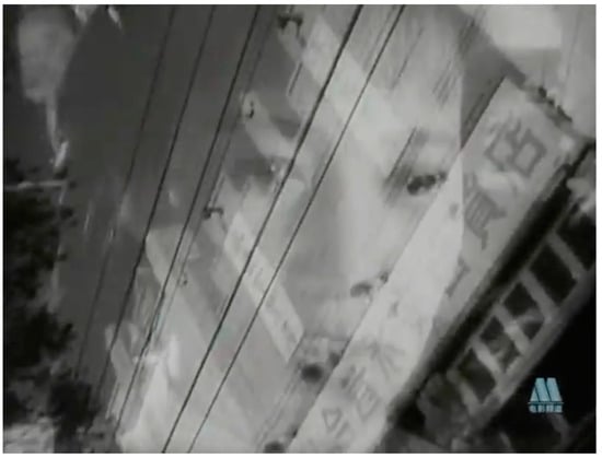 The transformation of Lanying is represented as a rectification of the relationship between the aural and the visual, in which sound takes on a commanding role over the previously aberrant vision. The transformation occurs when Lanying reads a newspaper report praising Mancang’s new invention that solved the fertilizer shortage in the village. This encounter prompts Lanying to reassess her previous negative ideas about agricultural labor. Her flashbacks that appear in double exposure are structured by the sound of the bell and mediated by shifting non-diegetic music that reflects her emotional responses to past events in a new, human way. As Lanying engages in a reflective examination of her past, the film’s score evolves to become animated as the camera progressively zooms in on her face. The montage of flashbacks serves to illuminate various pivotal moments in her history, each accompanied by a distinct musical theme that underscores her emotional response to these memories. The flashback depicting the villagers’ enthusiastic participation in the people’s commune is underscored by lively and festive music. In contrast, the flashback of her early morning rendezvous with Mancang is accompanied by warm and evocative music. Conversely, the flashback illustrating the negative influence of Dajinzi is paired with tense and dissonant music, which amplifies the discomfort of the recollection. During this sequence, Dajinzi’s face is superimposed over images of the city, with the camera employing a Dutch angle to convey a sense of disorientation, unease, alienation, and absurdity. [Figure 4] The film then transitions to a flashback of Lanying’s fight with Mancang and the subsequent criticism she receives from others, accompanied by stirring and dramatic music. The final flashback, which depicts the moment when Dajinzi is discovered sneaking back to the village from the city in a state of shame, is punctuated by a resonant drumbeat.