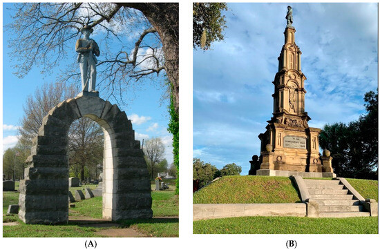 The Civil War monuments installed by communities across the North and South from the 1860s into the first quarter of the 20th century transformed the civic landscape and the place of the military in national life. In this way, the United States became a leading contributor to the transatlantic canon of war memorials (Brown 2019). These monuments have served as tools to facilitate remembering, commemorating, passing on knowledge, and expressing values and meanings (Smith 2006, p. 83). As vessels of memory, these monuments and memorials were/are reflections of culture and history (Baugher et al. 2024). Commemorations can take the form of a great variety of monuments, memorials, and markers. They were erected for a variety of reasons, beginning with memorialization of the fallen and later to honor aging veterans, commemoration of significant anniversaries associated with the conflict, and celebration of the actions of military leaders. Many of them were placed in cemeteries (Figure 1A). and parks (Figure 1B). Later, however, during both the Jim Crow and Civil Rights eras, many more were erected in conjunction with an organized propaganda campaign to terrorize African American communities and distort the past by promoting the “Lost Cause” narrative (SPLC 2016).
