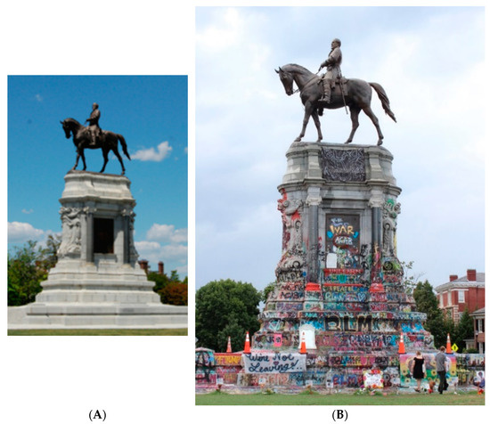(A) Triumphal statue of Robert E. Lee on Monument Avenue in Richmond, Virginia, prior to removal. The Lee statue received a 2018 epitaph “Ceci n’est pas un hero” (“This is not a hero”) (Beetham 2018; Creative Commons Attribution-Share Alike 4.0 International license, Wikimedia Commons); (B) The “decorated” statue of General Lee on Richmond’s Monument Avenue, statue and graffiti-laden podium now removed, stood as a moving witness to the Black Lives Matter movement. Photo courtesy of Richard Veit 2020.