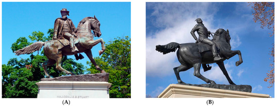 In 2019, in Richmond, Virginia, an African American sculptor erected a statue on horseback that mimics, replete with modern clothing, the classic “heroic” Confederate figure of J.E.B. Stuart (Figure 3A) and in the classic pose of the equestrian warrior in antiquity. In this case, the African American “Rumors of War” statue (Figure 3B) by artist Kehinde Wiley provides an officially recognized counter narrative to the nearby Confederate statue. “Rumors of War” is a bronze monumental equestrian statue of an African American youth wearing modern-styled dreadlocks in a ponytail, jeans ripped at the knees, and Nike high-top sneakers. It was created in response to the statue of Confederate General J.E.B. Stuart in Richmond, which was in turn based upon the 1889 statue of Sir James Outram on horseback by the British sculptor John Henry Foley, which stands in Calcutta, India (LOC; Driggs 1997). “Rumors of War” was originally unveiled in September 2019, in New York’s Times Square. In December 2019, it traveled to its permanent home at the Virginia Museum of Fine Arts in Richmond, at the head of Arthur Ashe Boulevard, where it was situated near a row of Confederate statues and monuments, including the statue of J.E.B. Stuart [now removed], on the city’s Monument Avenue (Randolph 2020).