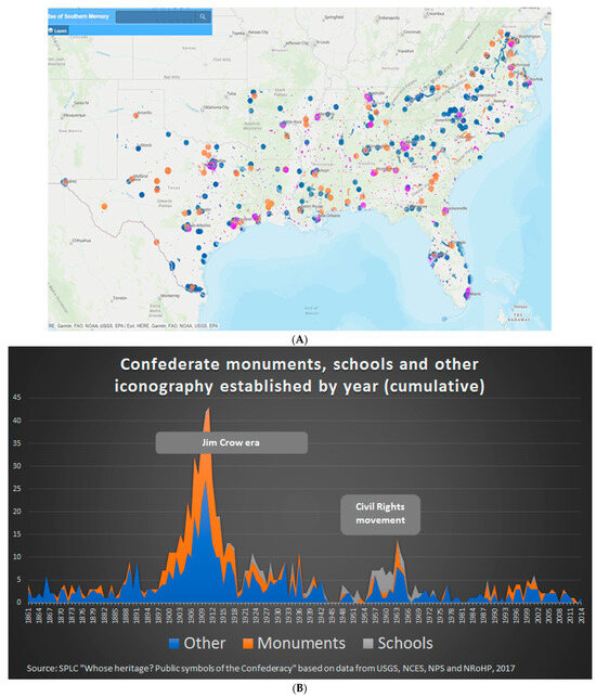 (A) Map showing geographical place name distributions form the Digital Atlas of Southern Memory (DASM), (Klibanov 2019); (B) Chart showing the number of Confederate monuments, schools, and other iconography by year (Nilsson 2020; SPLC 2016; Creative Commons Attribution-Share Alike 4.0 International license, Wikimedia).