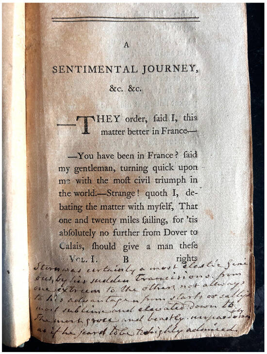 Not knowing the reader’s identity, we cannot make use of the ‘how X read Y’ model that predominates in marginalia studies (Grafton et al. 2024, pp. 11–14). This prevents certain lines of investigation, such as making comparisons with the reader’s wider annotating habits, a recognised library, or possible authorial practices (Miglietti 2024, p. 280). That said, we can consider how contemporary readers interacted with Sterne’s works—especially as Sterne actively encouraged those interactions, such as by providing a blank page in Tristram Shandy (‘here’s paper ready to your hand’) for readers to sketch an imagined portrait of the widow Wadman (Williams 2021, pp. 144–45). The innovative typographical and rhetorical elements of Sterne’s novels also prompted readers to seek hidden meanings within the texts (Newbould 2008, p. 2). By the early nineteenth century, this process of decryption of Sterne’s ‘borrowings’ led to accusations of plagiarism, notably from John Ferriar in Illustrations of Sterne (Gerard and Newbould 2021, p. 4). This work may have encouraged Hampshire clergyman Edmund Ferrers (1749–1825) to cram the margins of his 1770 edition of ASJ with annotations, especially relating to Sterne’s literary allusions. Whilst this was an opportunity for Ferrers to flaunt his bibliographical knowledge, Jackson asserts that it also offered ‘a form of legitimation’ for Sterne from contemporary criticism by placing his fiction into a wider literary tradition (Jackson 2005, pp. 90–92). This optimistic reading seemingly anticipates the ‘redemptive impetus’ of recent critical engagement with ASJ, suggesting that readers like Ferrer were working out their conclusions in an environment of shifting tastes (Gerard and Newbould 2021, p. 16).