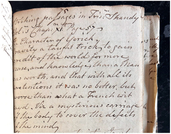 Readers often used marginalia to introduce comparative material to a text, but there are very few references to other authors or works in the Reed ASJ. Those that are mentioned—Bacon, Cervantes, Montaigne, William Warburton—do not especially expand our understanding of the novel (New and Day 2002, p. xlix-l).10 And far from the specificity generally characteristic of marginalia, in one note the reader even concedes that they ‘forgett who it is that says, The Graces should attend all our actions to give them their force…’ (II.3, MS45, 87).11 In fact, the reader’s main comparative sources were Sterne’s own works, especially Tristram Shandy.12 Whereas Horace Walpole placed ASJ in ‘disagreement’ with Tristram Shandy, finding its ‘delicacy’ in contrast to obtuse and bawdy aspects of the earlier work (Gerard and Newbould 2021, p. 1). The reader found that one actually illuminated the other, dedicating fourteen pages of the commentary to ‘striking passages’ from Tristram Shandy, comprising extracts without further remarks (Figure 3). This reveals the reader to be an attentive follower of Sterne, drawing extracts from across all nine volumes. They also demonstrate sensitivity to Sterne’s deliberate entanglement of authorial identity, describing the presentation of Parson Yorick in Tristram Shandy as ‘Sterns own characteristic truely drawn’ (MS75).