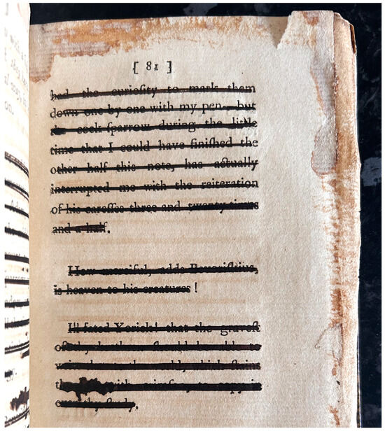 Over recent decades, book history and marginalia studies have developed as distinct strands of intellectual history, and their importance to literary reception is now firmly established (Miglietti 2024, p. 279). They offer approaches to the history of reading that emphasise its complexity and reflexive nature, often encompassing several processes going on simultaneously. Marginalia is so closely connected with the history of reading that it has been claimed to be ‘a route into all literate culture’ (Spedding and Tankard 2021, p. 1). Some core principles around historical annotation remain contested, such as the distinction (or lack thereof) between “authorship” and marginalia (Jackson 2013). It is argued that readers in the past considered annotation a creative practice in itself and not merely subsidiary to more traditionally substantive forms of expression (Miglietti 2024, pp. 279–80). To recover the historical role of annotation is to recover a significant ‘fragmentary’ practice, though one that may seem distant from textual cultures of the present (Spedding et al. 2021, p. 5). This is especially pertinent when considering the reception of authors who wrote in a distinctively fragmentary style. These findings are mostly drawn from scholarship of the early modern period, but the practice was no less ubiquitous for eighteenth-century works.1 H. J. Jackson’s survey of annotations in Boswell’s Life of Samuel Johnson (1791) draws on over 350 examples (Jackson 2001, p. 167).