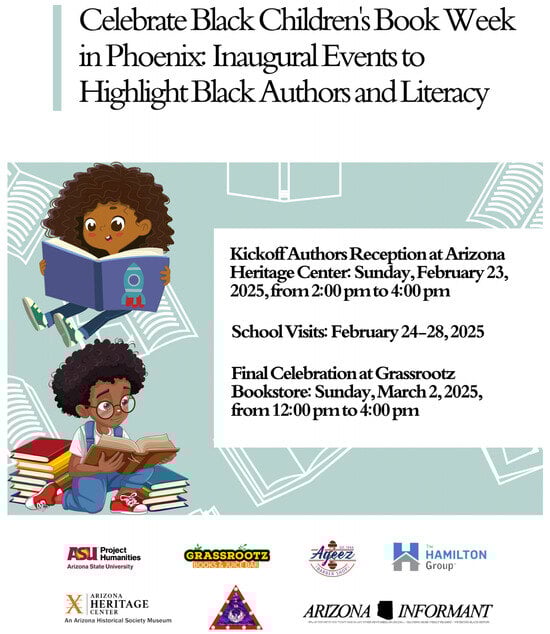 Marketing flier for inaugural Black Children’s Book Week in Phoenix, AZ (23 February–2 March 2025), sent out electronically on 27 February 2025 from the Arizona State University Project Humanities marketing team since Project Humanities was a leading event sponsor.