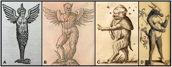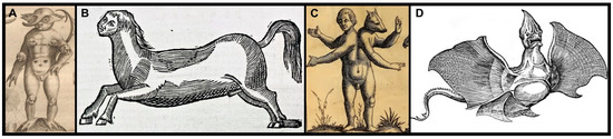 (A): The monster of Krakow from Fortunius Licetus De Monstris (1665), p. 256. (B): The monster of Verona from the works of the great surgeon Ambroise Paré (1649), p. 648 (C): A human–animal hybrid monster from Fortunius Licetus De Monstris (1665), p. 182. (D): Dry ray altered into the form of a dragon, from De Piscibus book 3 by Ulyssis Aldrouandi (1613), p. 443. All the images are in public domain.