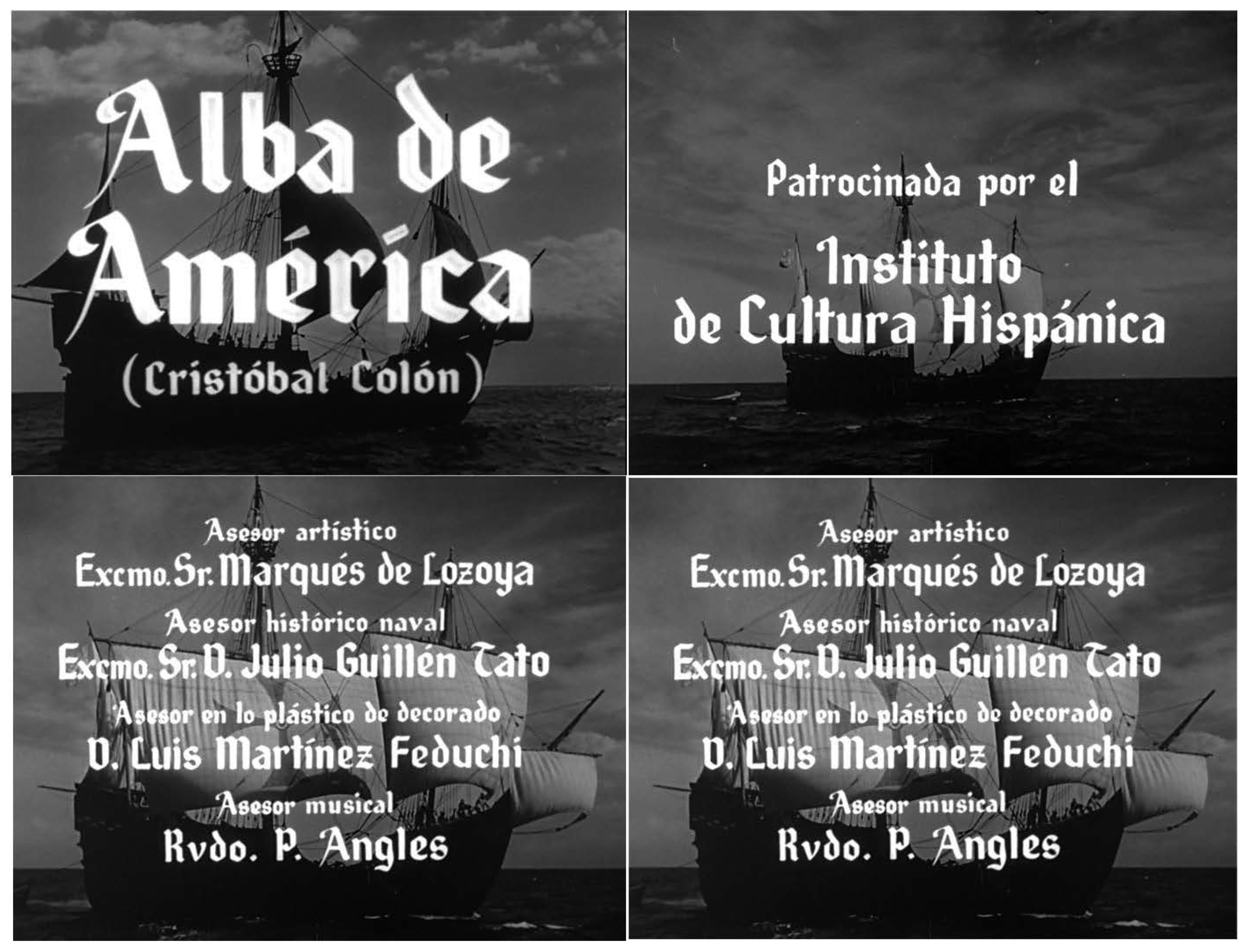 Because very few readers will have seen Juan de Orduña’s Alba de América, I take care here to dwell on what the film is doing without drifting into plot paraphrase. The emphasis is on allegorical work: how figures, settings, and rhythms carry a political theology consistent with the post-1945 redeployment of Hispanidad reconstructed earlier. What follows treats allegory as an instrument rather than a code; less a puzzle to be solved than a way of organizing perception so that authority appears obvious and continuity feels earned. The reading proceeds device by device, sequence by sequence, keeping the theoretical tools of §II in view and anchoring them in the historical conjuncture that made this kind of film both urgent to the state and, as reception showed, not especially welcome to paying audiences.