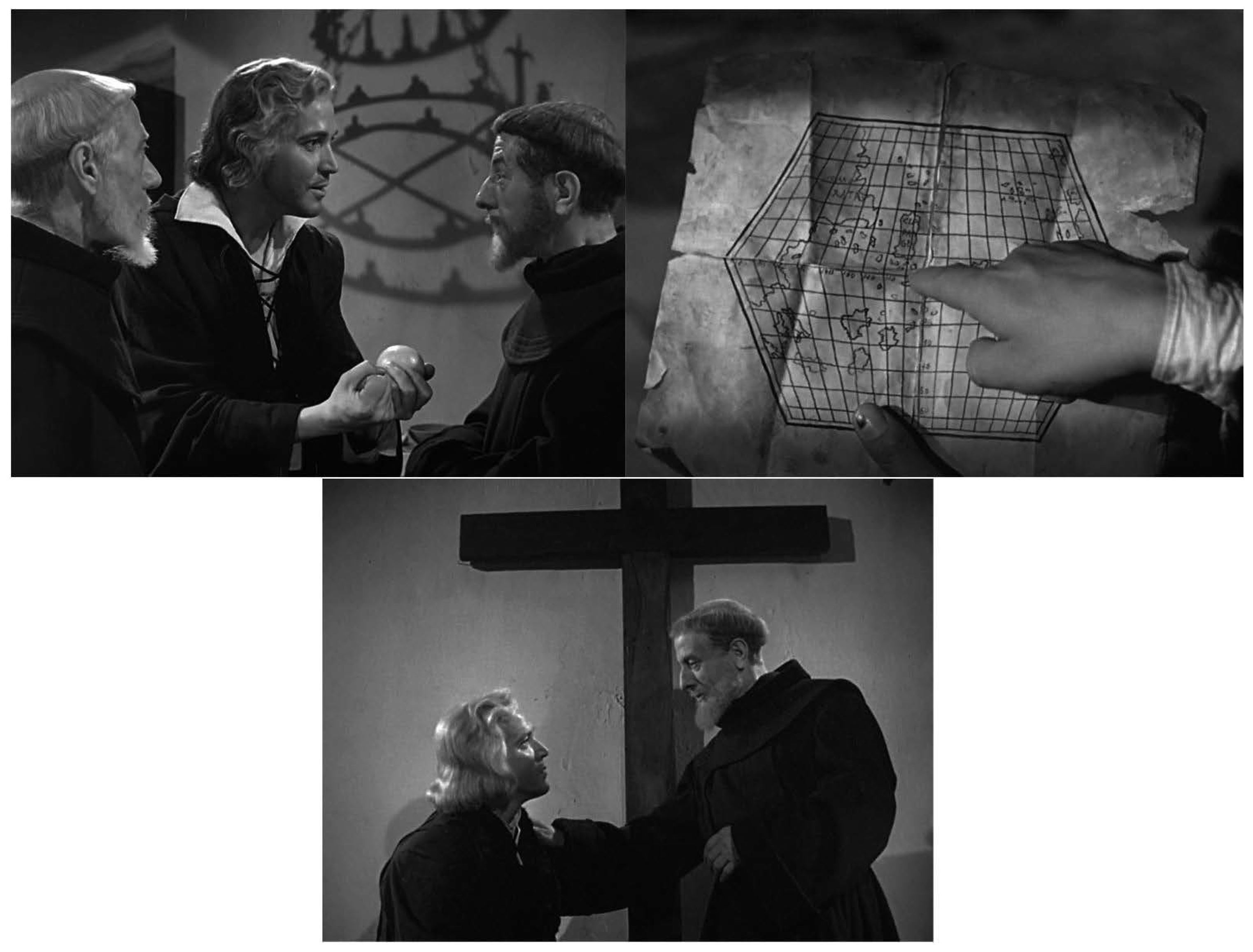 Figure 2). The cloistered mise-en-scène—stone, shadow, measured steps—slows time so that counsel can feel like benediction. The friars are not merely advisers; they curate the temporality in which the decision will make sense. In Schmitt’s terms, this is the theological analog of sovereignty’s decision: the moment that cannot be derived from rule but that guarantees the rule. The scene’s success lies in its pace. It teaches viewers how to breathe the film’s time, and that breath will return on the open sea when the mutiny tests whether decision can carry faith without visible proof.