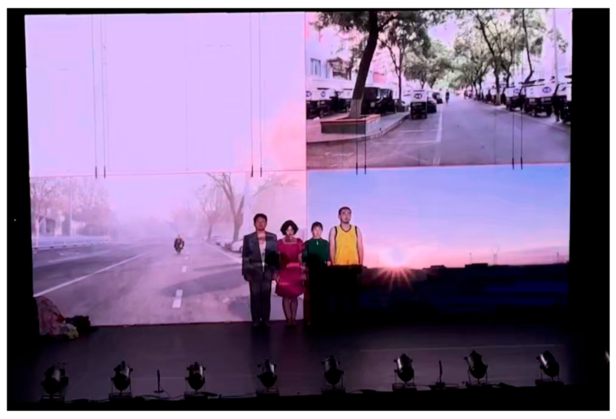 Figure 1). In the scene, the four performers featuring Geligaoer and his family stand still closely in front of the stage-wide projection screen, with three huge, documentary-style photos organized in a four-cell grid overshadowing their faces and bodies. In particular, the lower-left photo shows a delivery rider riding a motorcycle alone through a heavy smog in the middle of the street. Complementing this image, the lower-right photo captures the sun beaming and rising above the darkened urban landscape, whose contrast implies the strenuous working schedule of delivery riders that normally starts at six in the morning.