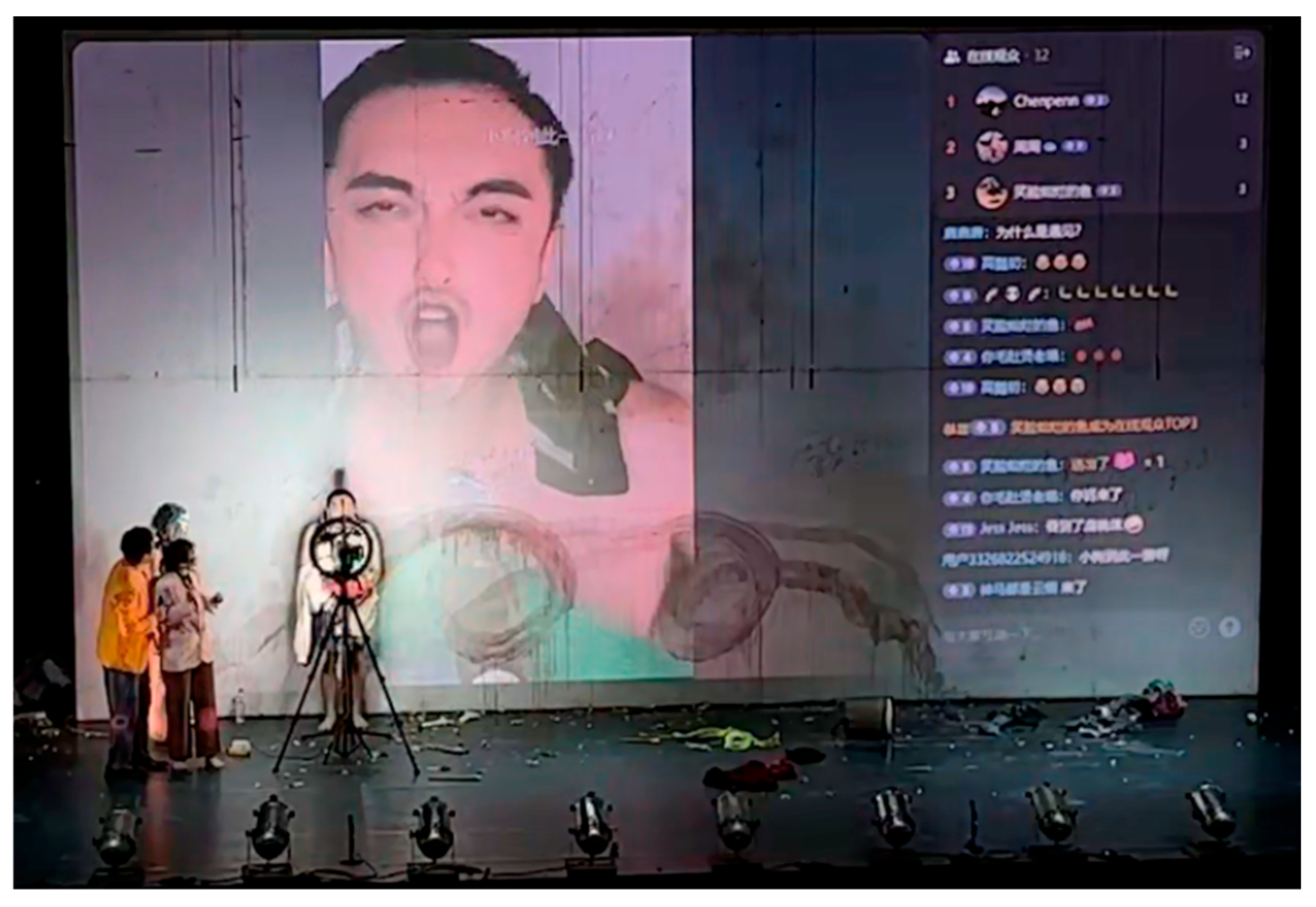 This identity transition offers the audience an illusion of agency, which seems to align them with the play’s omniscient narrator but indeed choreographs them as actors within the diegesis. As livestreaming viewers, the audience is scripted to keep the performance flowing: they participate both onstage, moving their bodies to the rhythm of Meimei’s singing, and onscreen, posting comments and