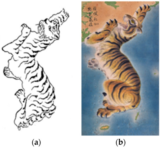 After two field trips to the Korean Peninsula, Japanese geologist Koto Bunjiro (1856–1935) claimed that the shape of the Korean Peninsula resembled an erect rabbit (Koto 1903, p. 3). At the time, the Japanese Empire was collecting information on Joseon to solidify its invasion of the country. Koto Bunjiro’s claim became influential because it aligned with the Japanese colonial policy that Koreans are fearful and passive like rabbits, thus requiring protection. However, the Korean poet, translator, and historian Choi Nam-sun challenged this claim and presented a map of the Korean Peninsula in the first issue of Sonyun (Laddie) in 1908, showing a tiger roaring with its front paws raised toward Manchuria (Figure 1a) (Choi 1908, pp. 66–67). Before this, there were no written references comparing the Korean Peninsula to a tiger. It was only in the late 16th century that Joseon had the surveying technology necessary to map the peninsula.