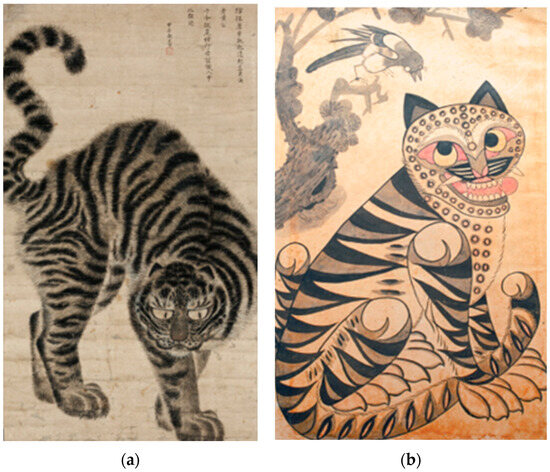 The Fierce Tiger (Figure 2a) is a folk painting that captures the majesty of the tiger. The Korean Peninsula is made up of 70% mountains and was once called the “Land of the Tiger” for its abundance of tigers. In pre-industrial Korea, there were several deep, dark mountain valleys; hence, the tigers in folk paintings are depicted in great detail, with faces, bodies, and tails that appear as if they had just emerged from the depths of the mountains. Some folk paintings, such as Magpie and Tiger (Figure 2b), are meant to ward off evil spirits rather than be representative, and the tiger is often stripped of its ferocity and caricatured by giving it squinty eyes. In folk paintings, the tiger was frequently the subject of humor and satire.