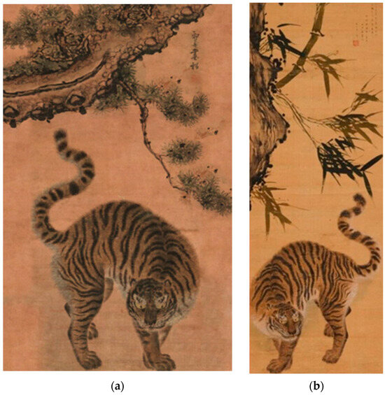 Kim Hong-do (1745–1818?)’s Song-ha-maeng-ho-do (Tiger Under The Pine Tree) (Figure 3a) and Jug-ha-maeng-ho-do (Tiger Under The Bamboo Tree) (Figure 3b) depict tigers dramatically and realistically. Common to 18th-century tiger paintings, the tigers, with their imposing stature, powerful, swishing tails, wiry fur, and piercing eyes, capture the viewers’ attention. The pine tree in the background is a numinous symbol for Koreans, accompanying births and deaths. For ages, Koreans have hung a ball of pine charcoal to ward off evil spirits when a child is born and made pine coffins when a person dies. Koreans have long lived in a culture of pine trees (Encyclopedia of Korean Culture, https://encykorea.aks.ac.kr/Article/E0029956, accessed 30 January 2023). Pine trees are seen in the background of Magpie and Tiger. The Korean white pine, a member of the Pinaceae family, is found in Manchuria, Siberia, the Amur region, Honshu and Shikoku in Japan, and in Korea, where it mostly grows in alpine areas (The Academy of Korean Studies 2023). The Siberian tiger is known to have lived in these pine forests, and the backgrounds of the folk paintings match Korea’s ecological environment.