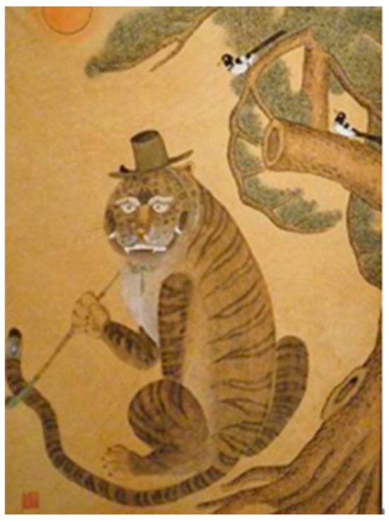 Historically, the tiger has held a pivotal position in animal worship among Koreans. For Koreans, the tiger is the manifestation of the mountain spirit and a companion (Cheong 2013, pp. 87–93). As a symbolic being, the tiger is directly linked to the history, culture, and national identity of Koreans. Tigers have been portrayed in Korean myths, folklore, legends, tales, and paintings that reflect national sentiments and perspectives. In modern times, the tiger continues to have a special meaning for Koreans.