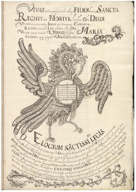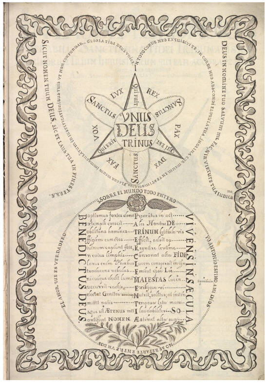 Appended to the prologue are two illustrations that synthesize the dualities elaborated in the prologue to visualize Guerrero’s dual submission to God and the Inquisition. In the first (Figure 3), a decorative frame encloses two forms: a heart and a circle. The inscriptions around each shape explicate their symbolism. The heart is formed from the words, “In toto corde meo exquisivite. In corde meo Abscondi eloquiatua. Inglina Cor meum in testimoniatua. Fia Cor meum immaculatum in iustificationibus tuis ut non confundar. Gloria Tibi Deus vnice”. While the heavenly inner realm of the heart is Latin, the earthly realm below is circumscribed with a rhyming quatrain in the vernacular. It reads, “Sobre el mundo todo entero, yo antonio estimo a mi Dios no se reparte entre un dos el amor que es verdadero”. Within these dualities, threes also flourish. Enclosed within Antonio’s heart is a trinitarian flower shape constructed entirely of triads, which enshrines the Trinity with the phrase “Unus Deus Trinus” at the center of the shape. Each petal contains the thrice repeated, “sanctus, sanctus, sanctus” and a temporal triplet, “qui fuit, qui est, qui erit. While extremely orthodox in its content, its form reinforces an ethos of complete submission—both the world and heart, in sacred language and the vernacular bound in unison under the banner of God’s name.