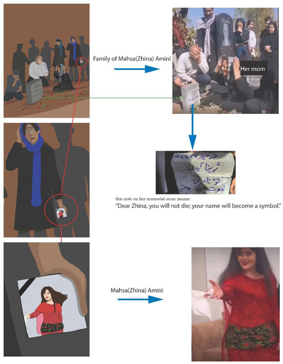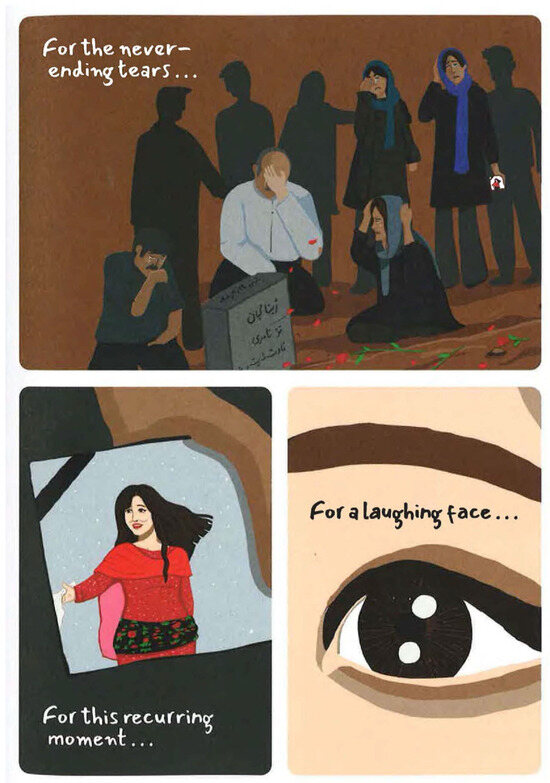Baraye is Persian: برای, lit. “for” or “because of”. It is a power ballad inspired by the death of Amini and its aftermath. At the 65th Annual Grammy Awards, in 2023, the song won the first-ever special merit award for Best Song for Social Change, presented by First Lady Jill Biden.17 The award is now an annual category and will be an interesting space to watch. The slogan “Woman, Life, Freedom”, which is used in the song, was and is also a protest rallying cry. It has become an unofficial anthem of the wave of protests sparked by her death. While the song itself does not say her name, her face, her family, and her own image, taken from photographs, appear in the comic art rendition of the song (Figure 12), juxtaposed with the words, “For the never-ending tears…”, “For this recurring moment…”. “For a laughing face…” (Adiban and Vahid 2024, p. 37). This is the comic labor done by Adiban and Vahid with the photos of Amini and her family. This is the curation of Amini’s symbolic status, that she does not get to do for herself.