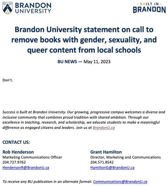 A large number of people in the audience for the meeting held up signs supporting LGBTQ people, while others held signs declaring their one-word response to the proposal: “Don’t”. The trustees ultimately voted 6:1 to reject a proposal to create a committee of trustees and parents to review books available in division schools. The one word, “Don’t”, that people brought on their signs is also the official Brandon University Statement on the call to remove books with gender, sexuality, and queer content from local schools, issued as one word on 11 May 2023 (Figure 3).