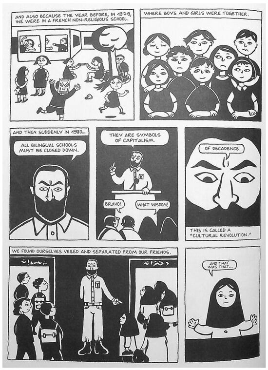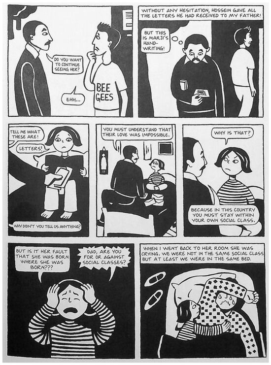 With a great deal of the content and action of Persepolis being set and situated within educational contexts, many of them European, an intersectional feminist approach to Persepolis must consider education itself to be a space of privilege, and thus one of exclusions. The juxtaposition of Mehri and young Marji is visually, politically, and educatively stunning, in the comics classroom. Not everyone gets to write their bildungsroman, for reasons to do with class and education as well as everything else. Satrapi’s work gives visual witness to this, through the educational disenfranchisement of her maid, Mehri (Figure 6). Poor, female, and illiterate, she can be viewed as subjected to intersectional discrimination. Chute describes Persepolis as “keenly feminist” and also draws reader attention to the text as modeling a “feminist methodology in its form” in the emphasis on visual and verbal witnessing and practices of “not forgetting” (Chute 2008, p. 94). Readers witness the servant class being excluded not just from literacy, but from love, in a scene in which Mehri shares a bed with young Marji but does not share the same kind of life. Mehri is not the writer of the love letters to the neighbor’s son, it is Marji in the book. This son simply gives them back, on learning that his love interest is lower class. And that is that.