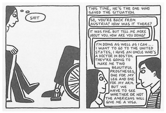 In The Limits of Autobiography: Trauma and Testimony, Leigh Gilmore observes that “Representations of trauma, however, make demands on audiences. As new forms emerge, including visual autobiography and memoir, new interpretive practices must develop to address them” (Gilmore 2001, p. 158). Satrapi develops a distinctive and respectful format for storytelling to handle the issue of disability in Persepolis, in which Kia Abadi, a person living with disability after the war, offers to share a story with Marjane, saying to her, after a discussion around his disability and the need to travel to the US to get prostheses for his leg and for his arm: “One of my friends told me a great story. Do you want to hear it?” (Satrapi 2004, p. 263). In Figure 8, readers begin to move with Satrapi through a learning process, towards the brutal knowledge that even when everything is fixable, you cannot be perfect.