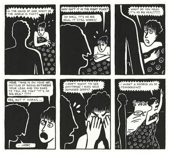 The planned perfect wedding night reveals that this version of male perfection is not normative, with the penis not in the usual place (Satrapi 2004, p. 265).