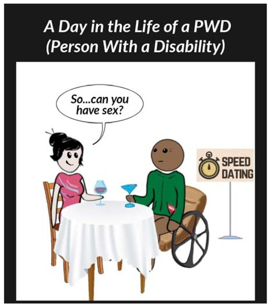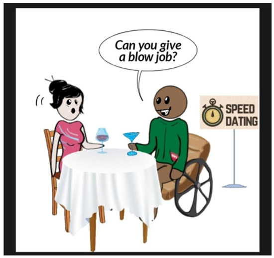 In Figure 10, the female character asks the wheelchair user if he “can” have sex. The male wheelchair user follows up, in Figure 11, by asking if she “can” give a blow job. Later in the cartoon series, the woman’s anger at this question leads the wheelchair user to clarify the situation with: “I thought we were asking each other personal questions. Is that not what’s happening?”12 The call-out here around a sense of able entitlement that produces intrusive and offensive curiosity about the sex lives of persons living with disability is very effective. In “Feminist Comics in an International Frame”, Sally Munt and Rose Richards state that “It is the piercing directness of comics that makes them efficient for political messages” (Munt and Richards 2020, p. 2). Talking about disability is political, as people with disabilities both belong and matter in society, and it is a fact that the current president of the United States, Donald Trump, engaged in visual mockery of a person with disability, in what in the comics world would be caricature, on the campaign trail for 2016, with no repercussions.13 Trump performed an impression of Serge Kovaleski, who suffers from a congenital joint condition, at a rally. He also used a 2001 article by Kovaleski to back up widely disputed claims that thousands of Muslims in New Jersey celebrated the 9/11 attacks.14