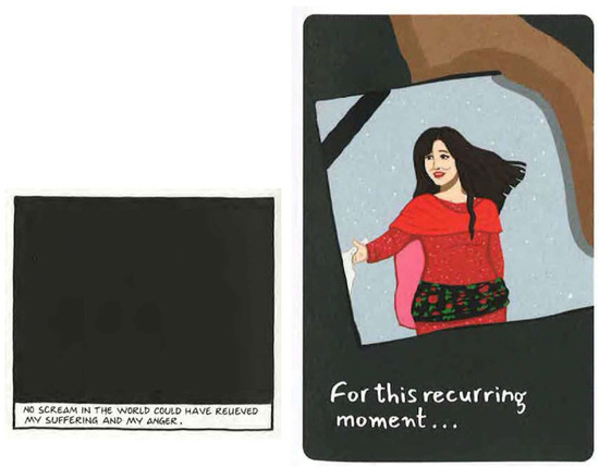 Marji’s anger and pain bring readers the black panel, Figure 7, at the end of her realization about the death of a friend, after seeing and processing the visual fact of the bracelet. The subsequent blank, black panel is one way of showing the impossibility of fully representing pain and trauma. Every comics reader recognizes the black panel as the panel of death. For Satrapi, it is the panel of anger as well: “No scream in the world could have relieved my suffering and my anger”. Sidonie Smith observes that “For, at the same time that graphic narration in the mode of crisis comics circulates in the information economy of contemporary human rights activism, the genre of graphic memoirs, or “autographics”, circulates as a register of remembering complex histories of violence—transnational, national, communal, familial, and personal” (Smith 2011, p. 66).