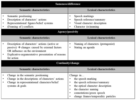 There is a close interaction between the semantic and lexical levels. Therefore, the comprehensive analysis of the dilemmatic spaces deals with linguistic categories and examines how the story is linguistically divided into thematic units and thus unfolds from the protagonist’s perspective. Conclusions about the dilemmatic spaces can be drawn from the linguistic markers, which include lexical and semantic units. For example, a character who is introduced as a role model for the protagonist (semantic level) will probably also be described with positively connoted attributes (lexical level), which automatically qualifies them as close to the protagonist (sameness instead of difference). Accordingly, these characters and their belief systems are shown in a positive light and thus also become role models for the recipients of the text.