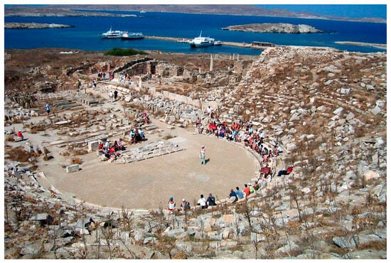 Tourists at the Ancient Theatre on the Greek island of Delos. In 1954, prior to his subsequent travels to Greece, Martin Heidegger confided in a letter that ‘Delos has long been my dream’ (). ‘Only through the experience of Delos’, Heidegger went on to write in his travelogue Sojourns, ‘did the journey to Greece become a sojourn… [a] field of unconcealed hiddenness that accords sojourn’ (). The philosopher further remarks that the nearby island of Mykonos, ‘the fashionable spot of international tourism’, cloaks and protects—in other words, provided an expedient means of diversion from—the more ‘meaningful island of Delos’ (ibid, p. 36). Photograph by Wally Gobetz, www.flickr.com/photos/wallyg/143687139 (accessed 7 March 2025)—Creative Commons Attribution-NonCommercial-NoDerivs (CC BY-NC-ND 2.0).