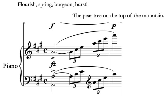 Looking at the score for Schubert’s Piano Quintet Opus D667 (post. Op. 114) in A major suggests that “Flourish, spring, burgeon, burst” may well refer to the simultaneous entry of Violin, Viola, Cello and Double Bass – all marked by “f” for forte – while the “pear tree on top of the mountain” points towards the iconicity of the separate piano roll in the lower part of the score – marked in the double bass with “p” for “piano” (see Figure 1):