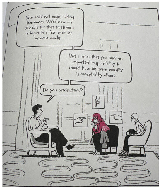 As readers, we are taken on Anne’s journey through the intertwined and sometimes conflicted relationship of text to image, to which Chute ascribes the “power of defamiliarization” (2015, pp. 198–99). Comics artists, Chute explains, create narratives “through a constant, active, uneasy back-and-forth” (199) between words and images and across time. Textually, Anne’s story oscillates among three time periods: a “present”; an extended analepsis beginning “more than two years ago” (p. 8), which is explicitly linked to Anne’s journals; and Anne’s memories of Alex’s baby- and childhood, represented as pages in a photo album. Visually and artistically, Durand direct readers’ understanding of these overlapping stories. Page structures and color choices convey both temporal and emotional shifts; storytelling happens on a standard two-column, four- or six-panel grid that is frequently interrupted by full-page panels or unbordered and de-gridded panels. The analeptic narrative is drawn primarily in black, white, and shades of gray, with occasional use of muted blue, to represent shadows or time, and pink. Anne’s vivid pink hair is often the only splash of color on a gridded page, suggesting the manga tradition of assigning central characters red hair to represent strong emotions (Poe 2022). Durand typically draws her characters’ clothing in black, white, and gray, although Anne is frequently nude, implying that she feels exposed in her difficulties; in one particularly emotional scene, Anne is confronted by Alex’s psychologist while wearing a pink sweater that matches her hair (pp. 74–84; Figure 1). When full-bleed or ungridded pages interrupt the narrative, they frequently use color very differently, to represent different aspects of Anne’s emotional or intellectual transitions. On “[t]he night of the announcement,” when her teenager “told me she was a boy,” Anne’s anxiety keeps her from sleeping. Three unbordered panels drawn primarily in red and pink express her emotions; the visual vocabulary of these panels emphasizes that Anne’s emotions are embodied. In the top panel, Anne’s face, a black silhouette with stark, round, white eyes, appears to float in a chaotic stream of red and pink. In the second panel, Anne’s anxiety becomes vivid red intestines with a snake’s face on one end, hanging outside of and curling around her abdomen. In the third panel, the snakes multiply, morphing into three red snakes twining her entire body, enclosing her in a hanging basket of snake bodies. Around Anne’s pink body and the red snakes, the declaration “It’s my fault I had her too young” floats in large, red, hand-lettered words (p. 16).